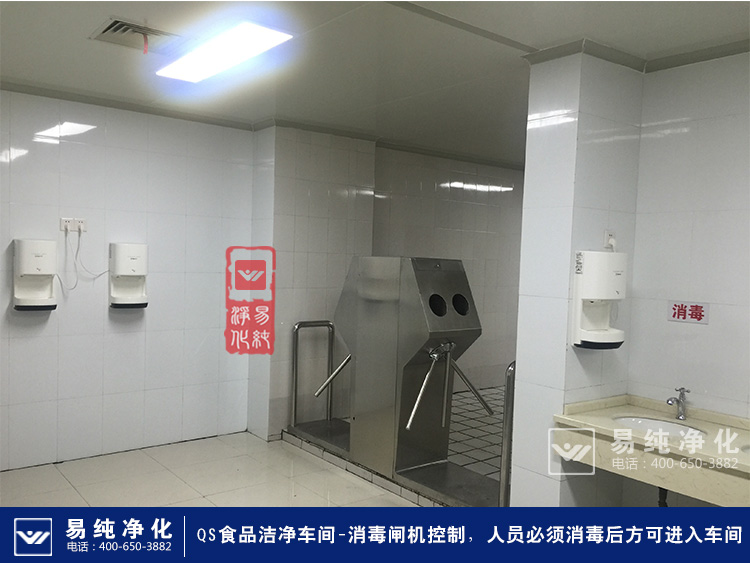 員工全部換衣后,需要進入風(fēng)淋室待等待區(qū),在等待緩沖區(qū),有員工著衣指南,同時配有更衣鏡,員工必須要對照圖片指南進行自己的衣著檢查,另外在此處還有一位工作人員需要檢查員工的首飾配帶和衣著整潔,穿戴是否正確。車間規(guī)定,任何進入車間的作業(yè)人員均不可配帶手飾且需要檢查手指甲的長度,指甲超過規(guī)定長度的均不可進入車間。在全部符合要求后,人員通過風(fēng)淋室吹淋,風(fēng)淋室為全自動感應(yīng)風(fēng)淋室,且?guī)в须娮踊ヂ?lián)鎖功能,員工只有經(jīng)過風(fēng)淋之后方可進入腳消毒池,員工腳部消毒后進入下一個環(huán)節(jié),就是洗手消毒環(huán)節(jié)。此處有專門的車間管理人員辦公室,管理人員會監(jiān)督員工進入洗手。在消毒之個環(huán)節(jié),企業(yè)更是不異重金采購消毒閘機控制系統(tǒng),員工必須將雙手伸手閘機對手部進行消毒后方可進入車間,消毒閘機配置了消毒液,當(dāng)員工將手伸入消毒孔內(nèi),閘機感應(yīng)裝置自動噴灑殺菌裝置對人員手部進行消毒,同時閘機開啟,且只能一人使用一次,這樣可以強制保障每位員工必須手部消毒方可進入車間。